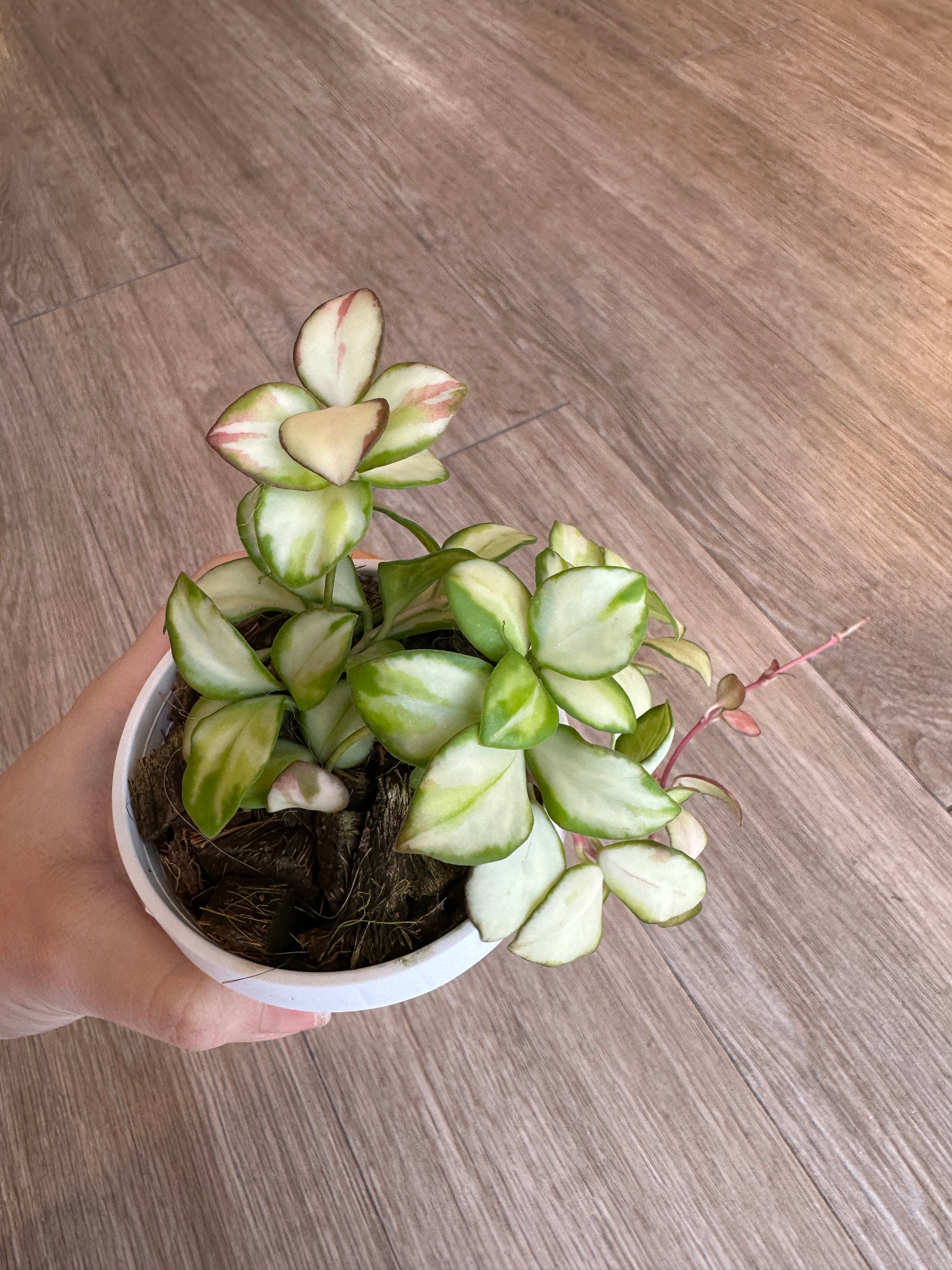 Hoya Heuschkeliana Variegated has a trailing growth habit, making it perfect for hanging baskets, shelves, or training along a trellis. It thrives in bright, indirect light, which helps maintain its vibrant variegation. Easy to care for and drought tolerant, this Hoya is ideal for both beginners and experienced collectors. When mature, it may reward you with clusters of small, bell-shaped flowers that release a pleasant caramel or butter-like fragrance. Mmm...smells like butter.